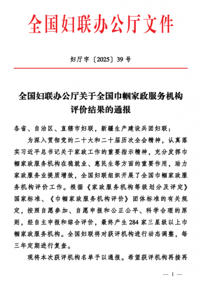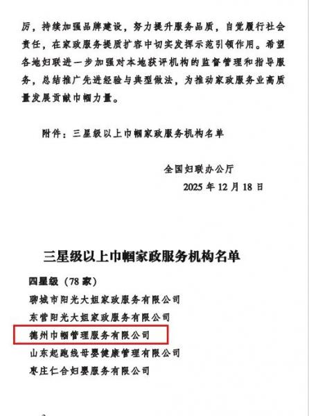 喜报传来,荣耀加冕!近日,全国妇联组织的全国巾帼家政服务机构评价结果正式公布,经自主申报、综合评审,德州巾帼管理服务有限公司凭借规范运营、优质服务与社会声誉,获评全国四星级巾帼家政服务机构!这份荣誉既是对我们深耕行业20年的肯定,更是对全体员工坚守初心的嘉奖。